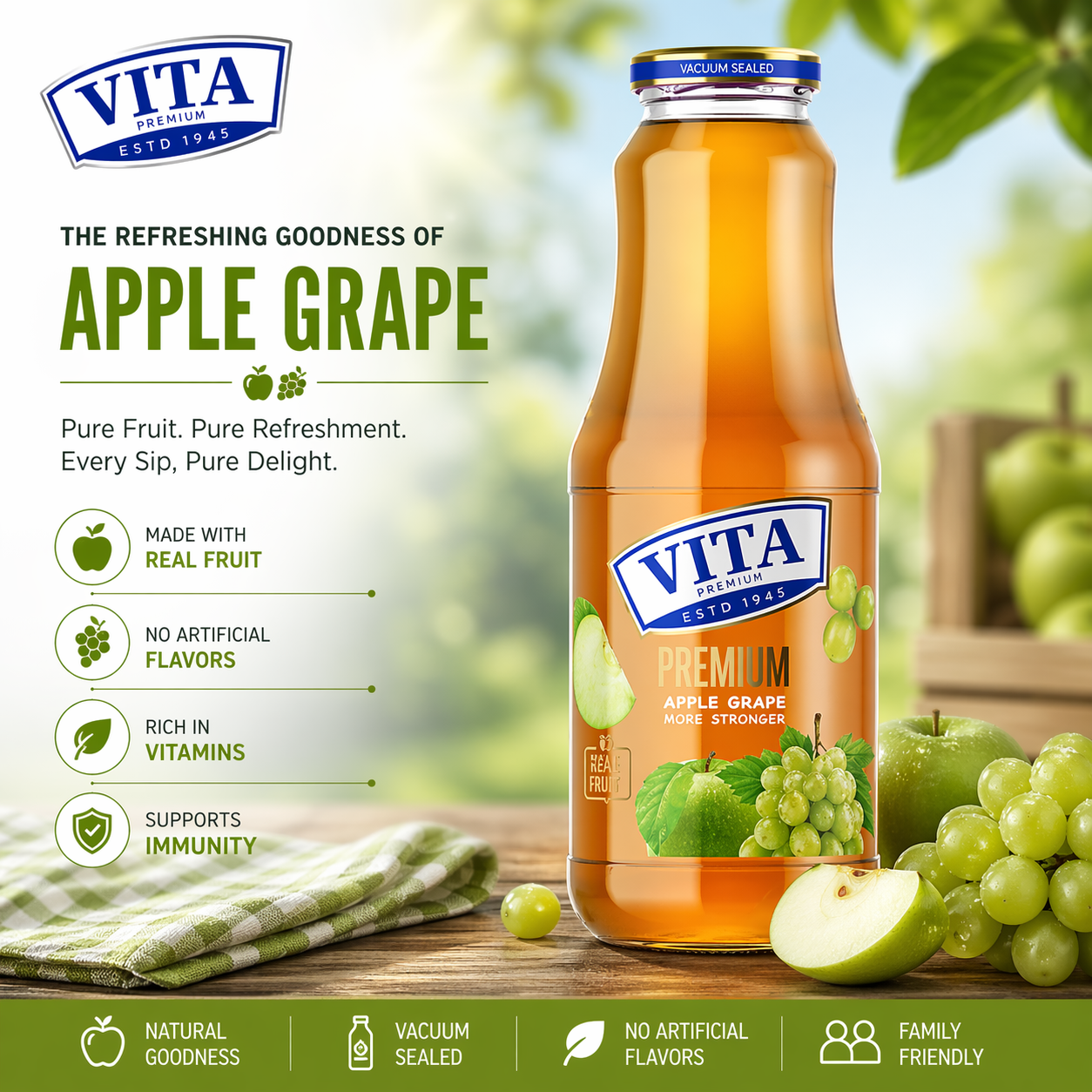 Whether you’re pairing it with meals, serving guests, or simply relaxing, Vita Apple-Grape Juice delivers natural taste and instant refreshment in every sip.